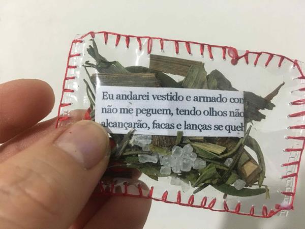 possui oração, 7 ervas, olho de cabra e mini figa.